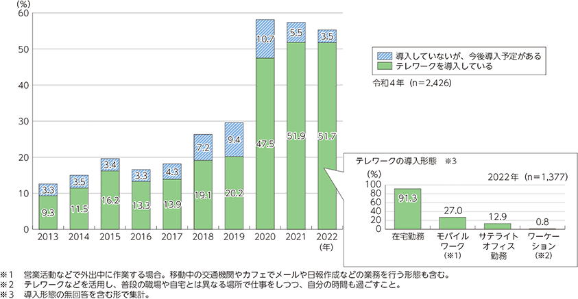総務省が発表した「令和5年版 情報通信白書」によると、企業の約半数が「テレワークを導入している」と答えています。